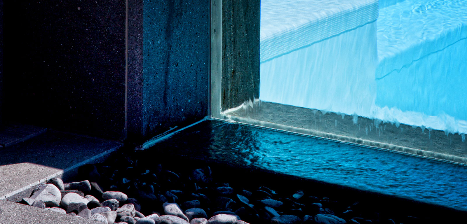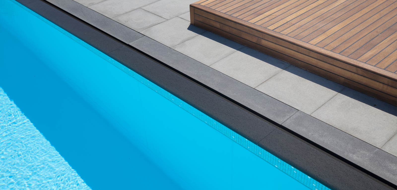 Con il bordo sfioro Trilogy, l’acqua raggiunge la pavimentazione, dove entra nel canale di scolo scivolando attraverso aperture quasi impercettibili. Il risultato, silenzioso ed elegante, è un fine velo d’acqua che scompare lungo il camminamento perimetrale della piscina, in un vibrante gioco di lucido e opaco in cui acqua e pietra divengono le protagoniste di perfette geometrie.