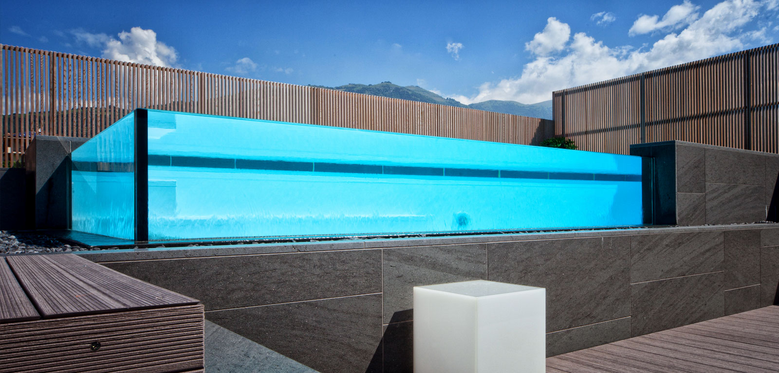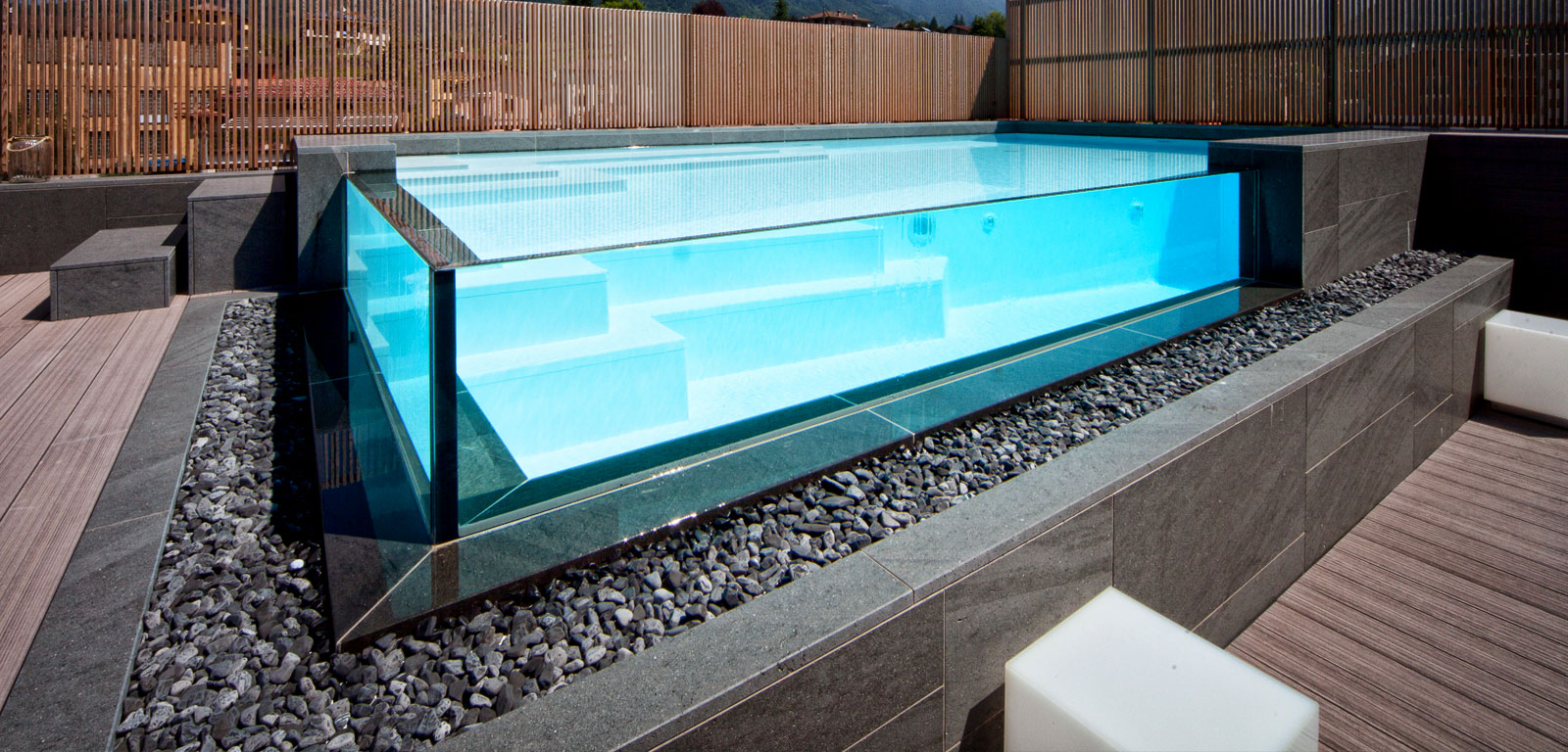 Per la realizzazione delle piscine impieghiamo esclusivamente materiali dal contenuto qualitativo molto elevato, mirando per ogni nostra realizzazione all'eccellenza. Che si tratti di skimmer o sfioro, di cascata o di piscina in cristallo, le nostre vasche sono sempre la massima espressione delle tecnologie disponibili oggi.